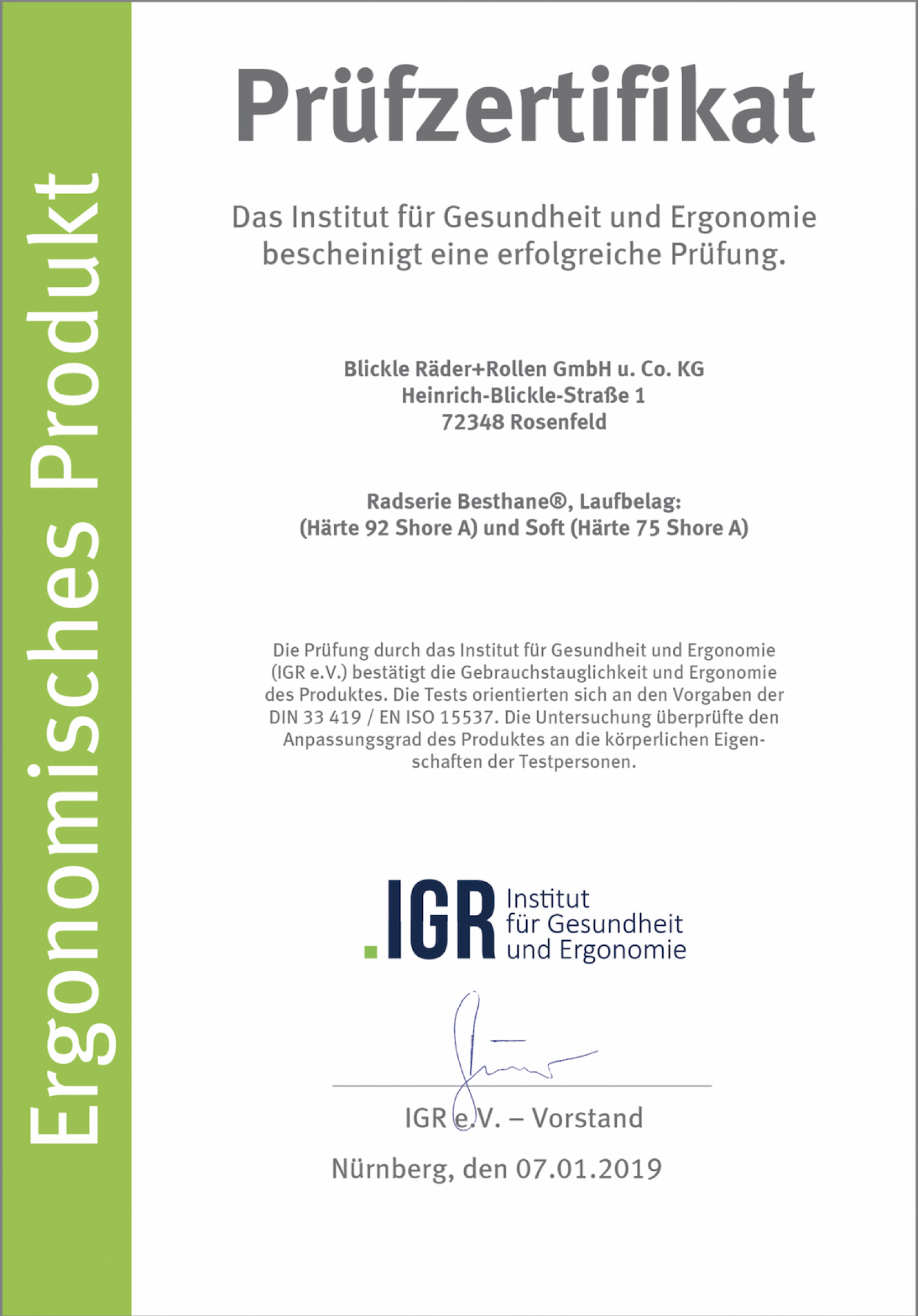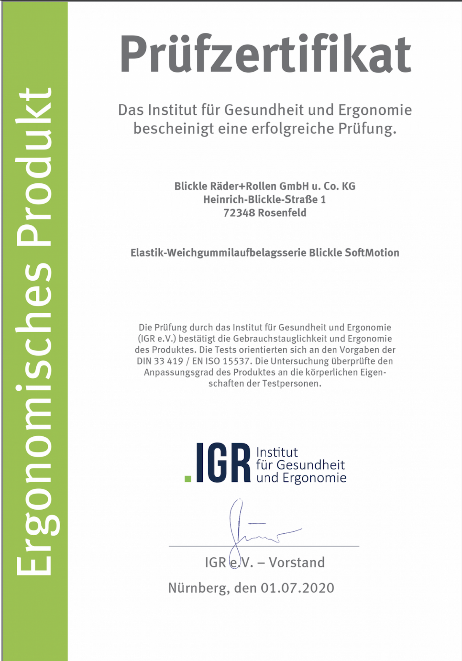 Og nu kan vi med stolthed præsentere endnu en IGR certificeret Ergonomisk produktserie. Blickles hjulserie med baner af blød elastisk gummi Blickle® SoftMotion, blev nemlig i juni tildelt samme certifikat. Med denne yderst bløde og elastiske bane på hjulene skånes lasten mod rystelser og støjgener reduceres kraftigt med en klar forbedring af arbejdsmiljøet til følge.