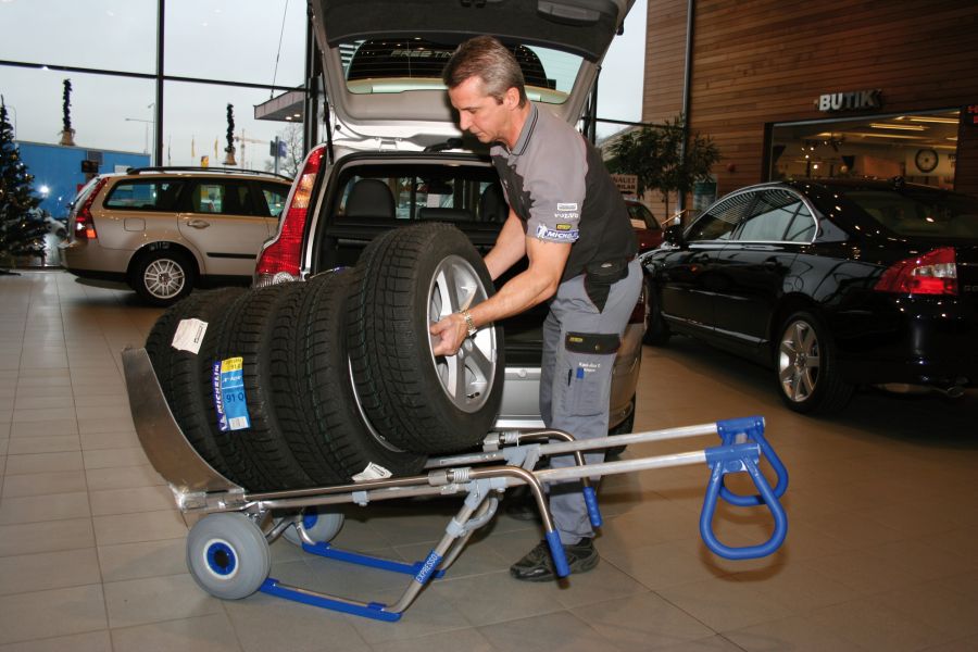 Dæksækkevognen fra Expresso gør det nemt at løfte og flytte stablede dæk både fra gulvet og fra en palle, hvilket gør arbejdet mere effektivt.