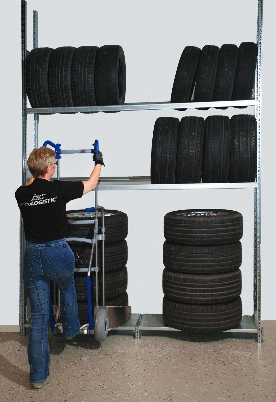For at forbedre arbejdsstillingen er vognen udstyret med 2 vinklede glideskinner, som gør det muligt at lægge den ned og arbejde i en ergonomisk korrekt højde. Det giver bedre komfort og reducerer belastningen ved af- og pålæsning af dæk. Glideskinnerne gør det desuden muligt at køre nemt op og ned ad kanter.