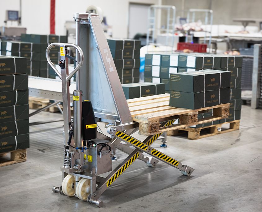 Med en elektrisk højdeløfter slipper du for manuel pumpning, så du får en optimal arbejdsstation. Den er udstyret med lukkede og vedligeholdelsesfrie kuglelejer og er fremstillet i AISI 304 rustfri materiale. Standard monteret med quick-lift. Godkendt til levnedmiddelindustrien. Løftefunktion er el-hydraulisk. Batteri 12/51 v/Ah.