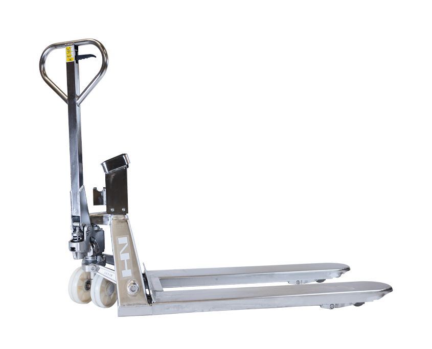 Palleløfter er fremstillet i AISI 304 rustfri materiale. Mulighed for tarering. Bogie nylonhjul giver en let og ubesværet kørsel.